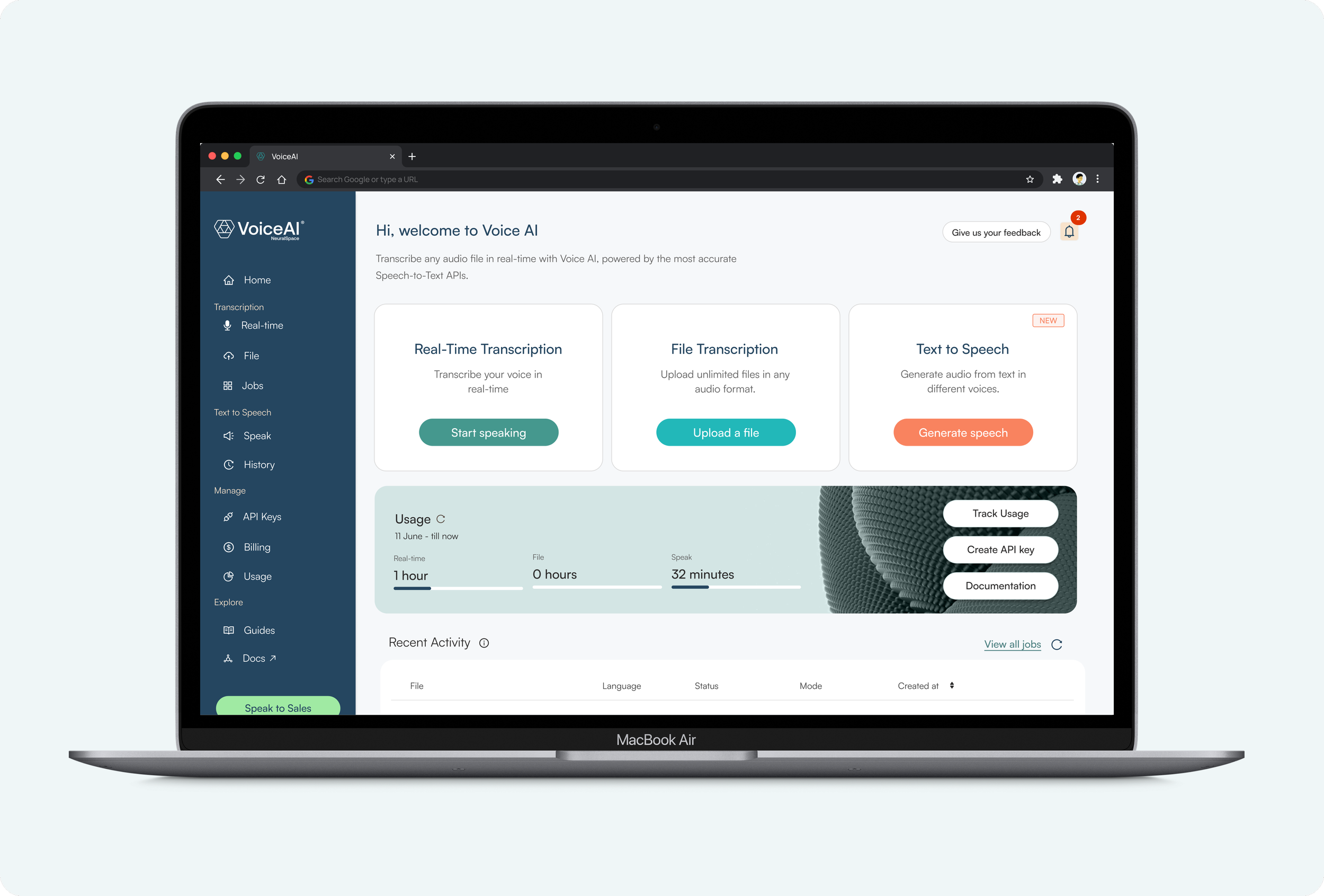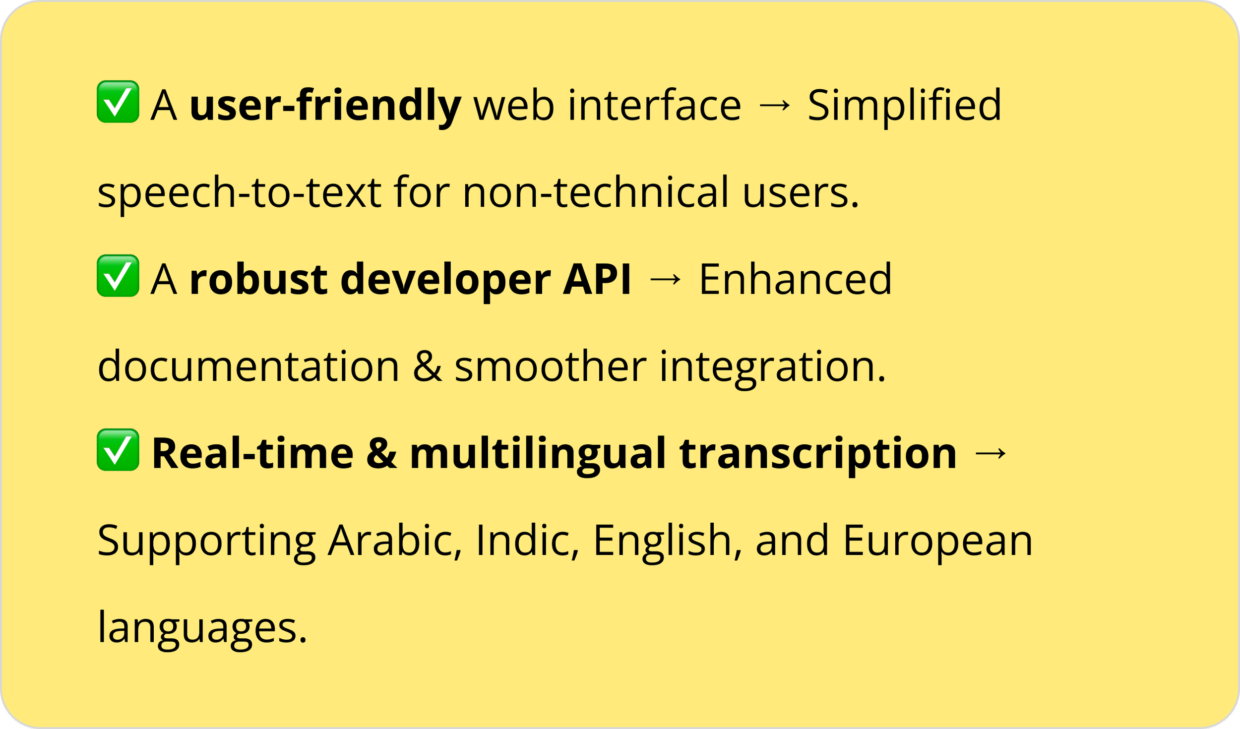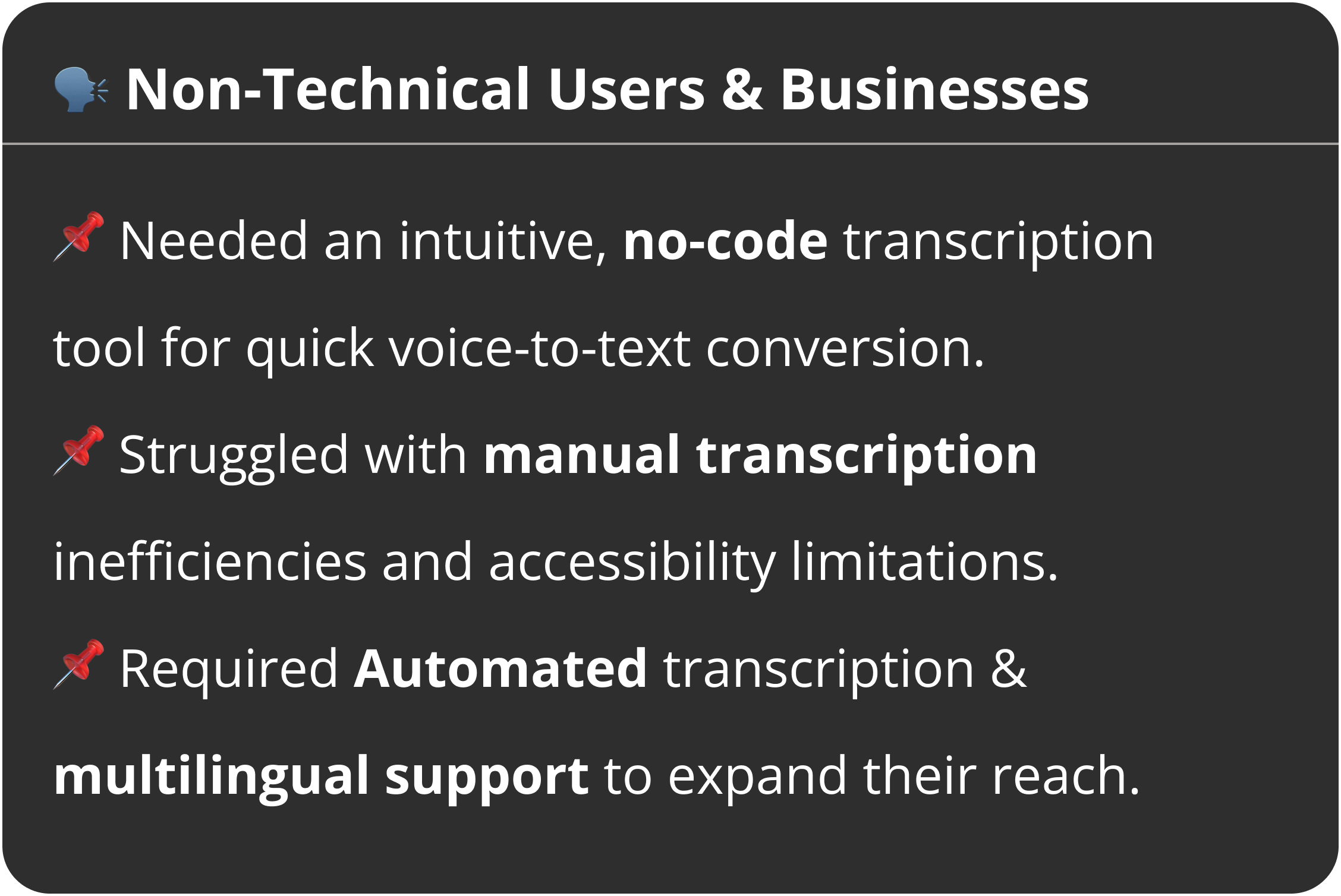 To bridge the gap between these diverse users, we created VoiceAI, a seamless, AI-powered transcription platform with: