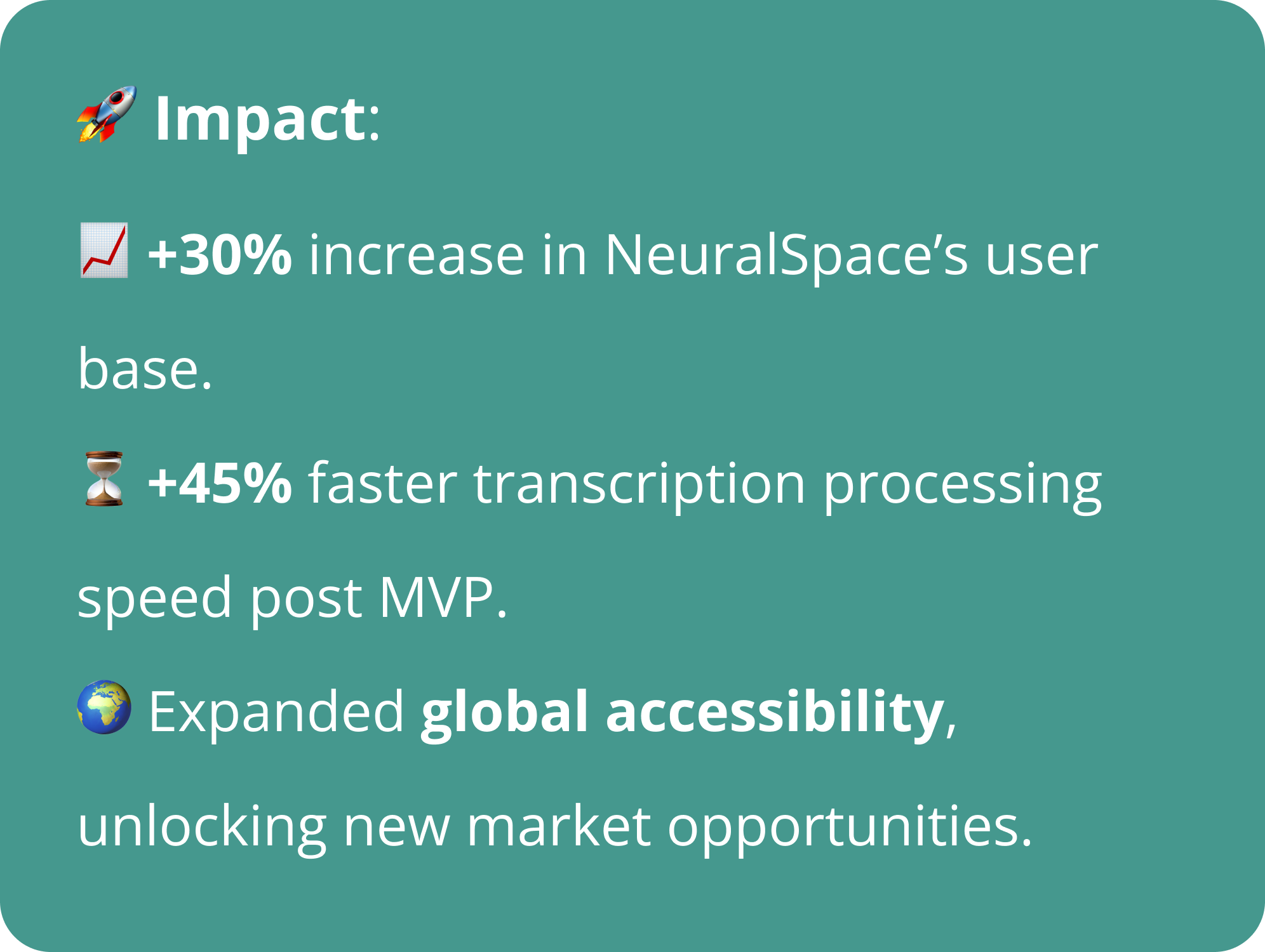 VoiceAI, a key product in NeuralSpace’s suite, automates both real-time and file transcription, eliminating manual effort and reducing processing time. With a multi-lingual support for Arabic, Indic, English, and European languages, it expanded market reach and increased NeuralSpace’s user base by 30%.