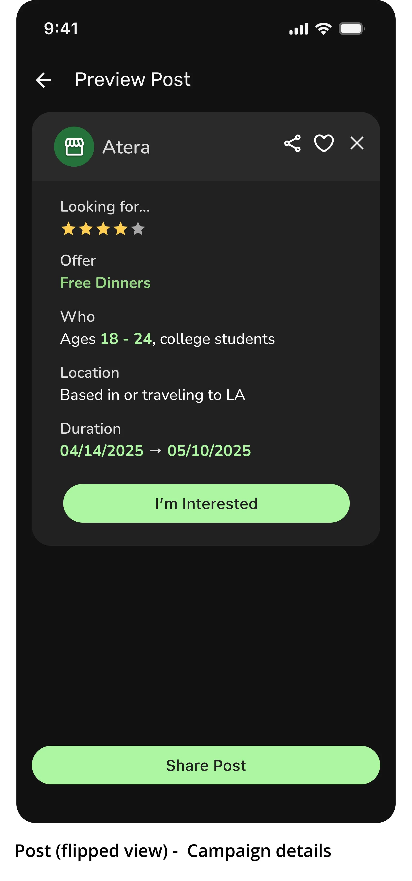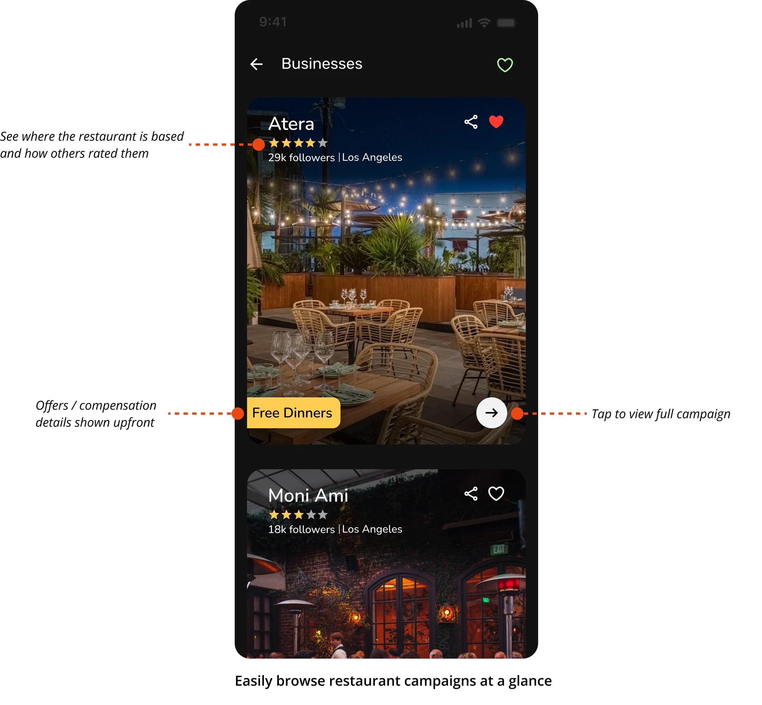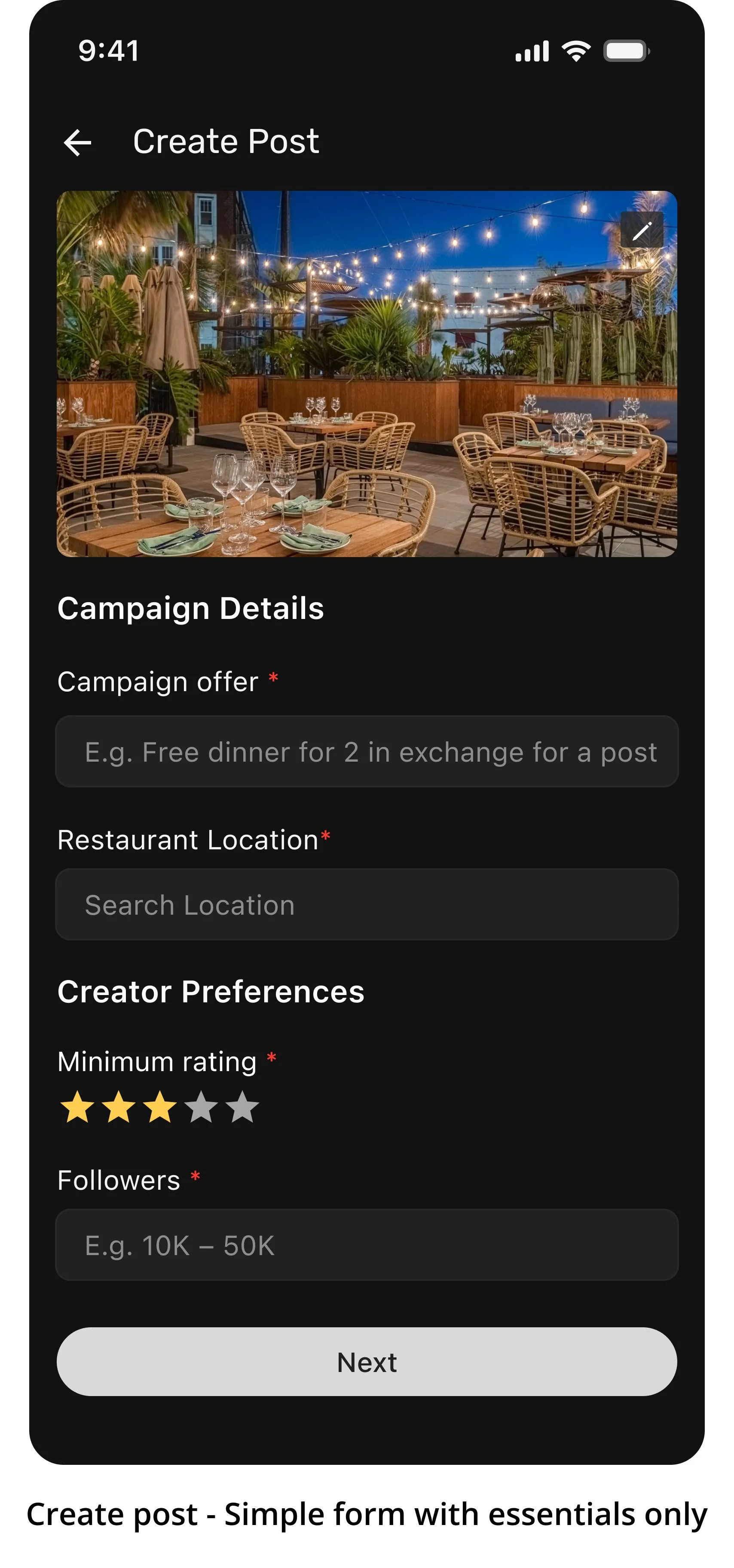 Restaurants can quickly set up a campaign by filling in only the essentials like the offer, location, and creator preferences. The preview feature lets them review how the campaign will appear before publishing, ensuring clarity and consistency.