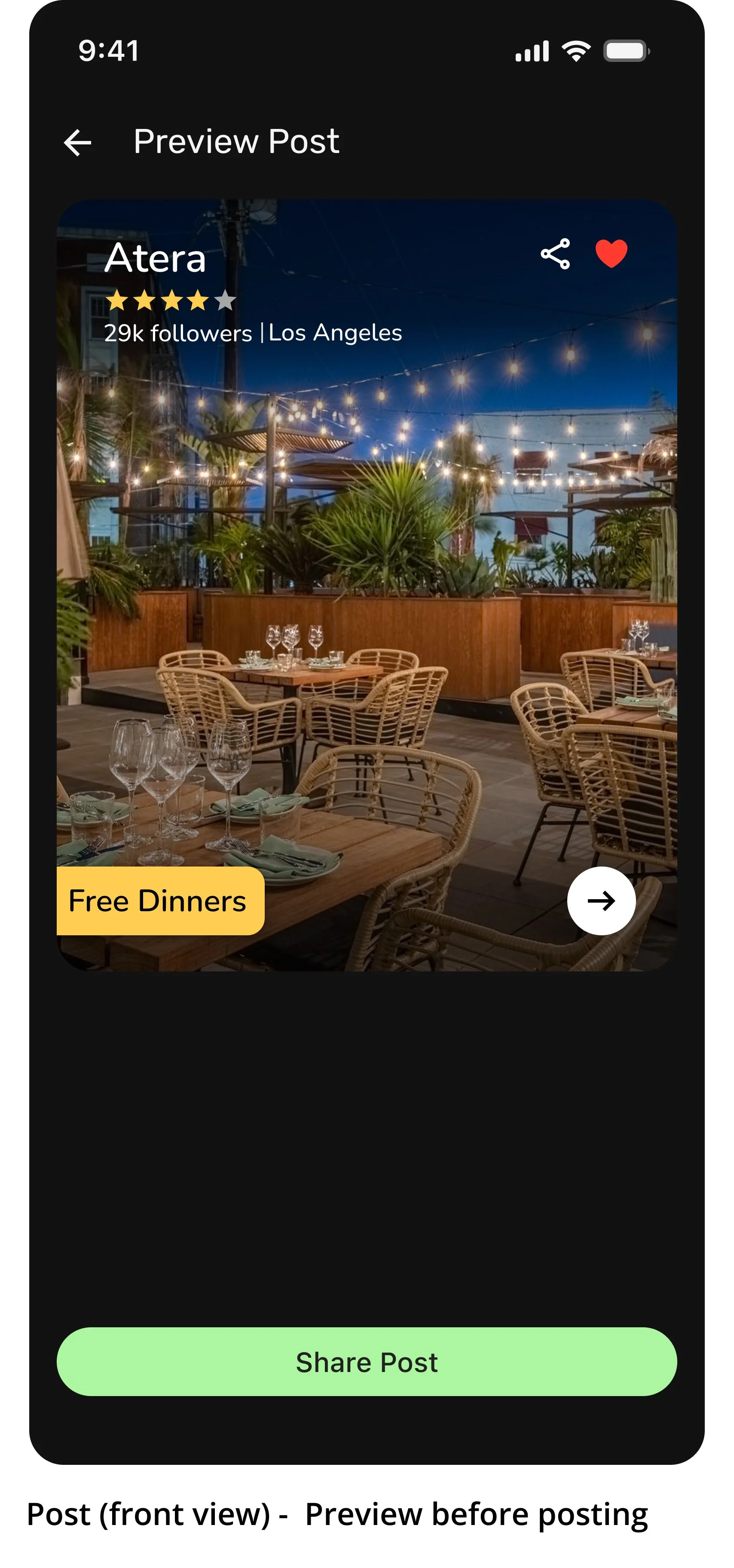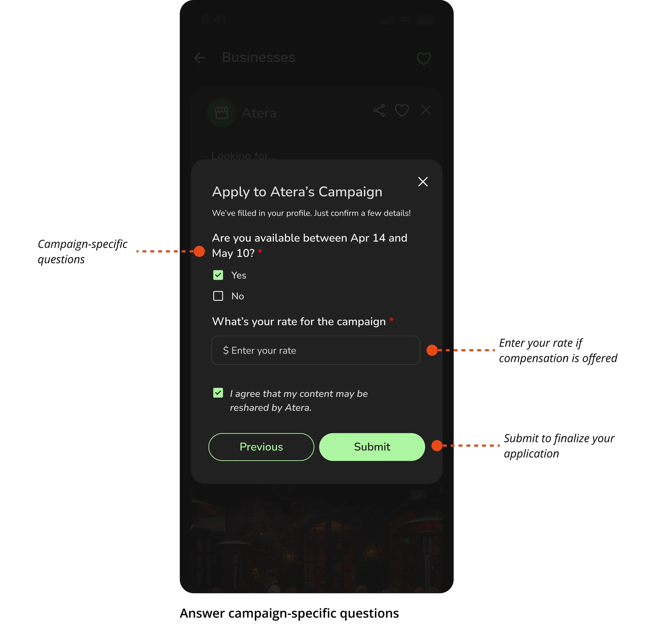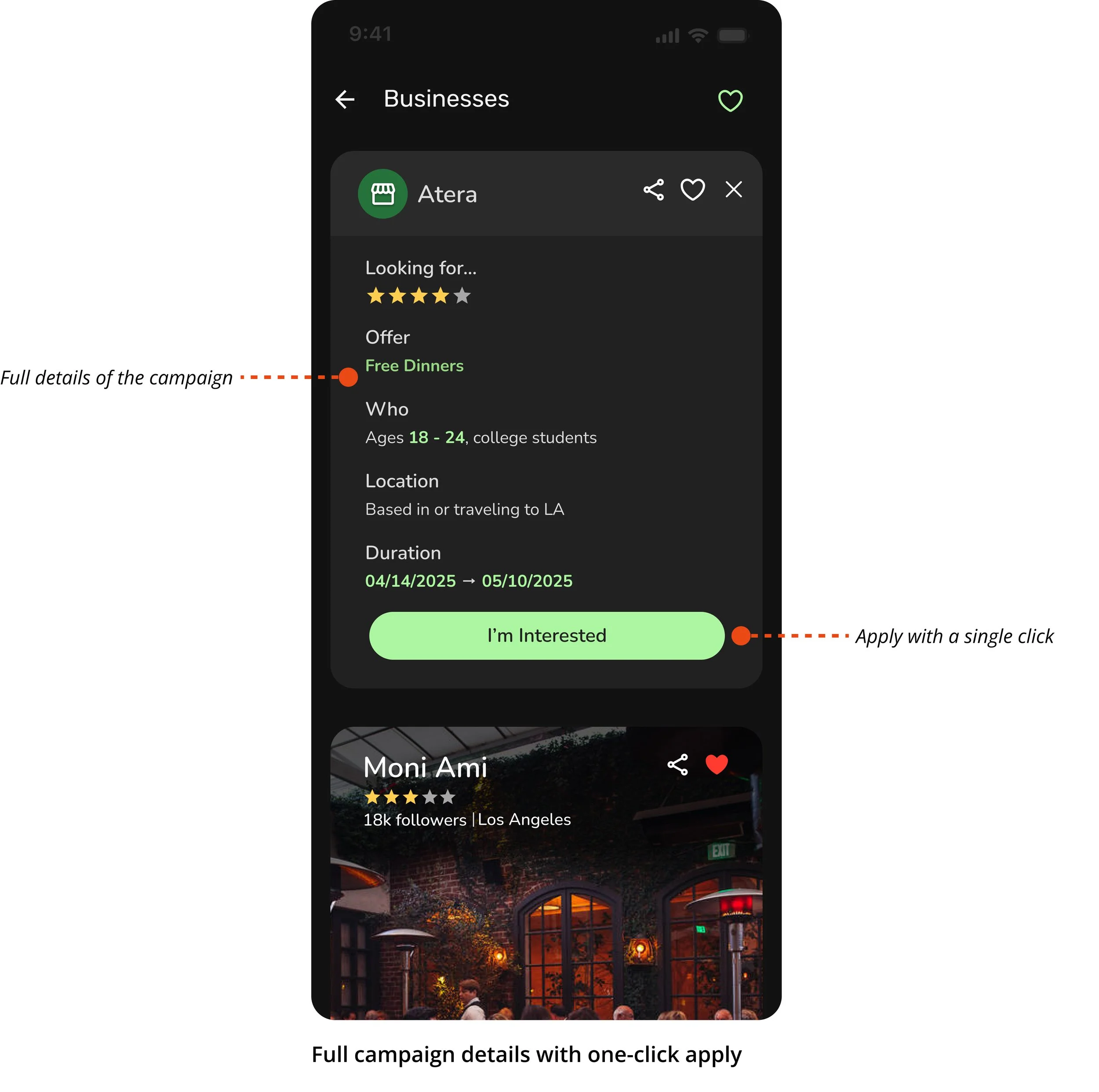 Restaurants can quickly set up a campaign by filling in only the essentials like the offer, location, and creator preferences. The preview feature lets them review how the campaign will appear before publishing, ensuring clarity and consistency.