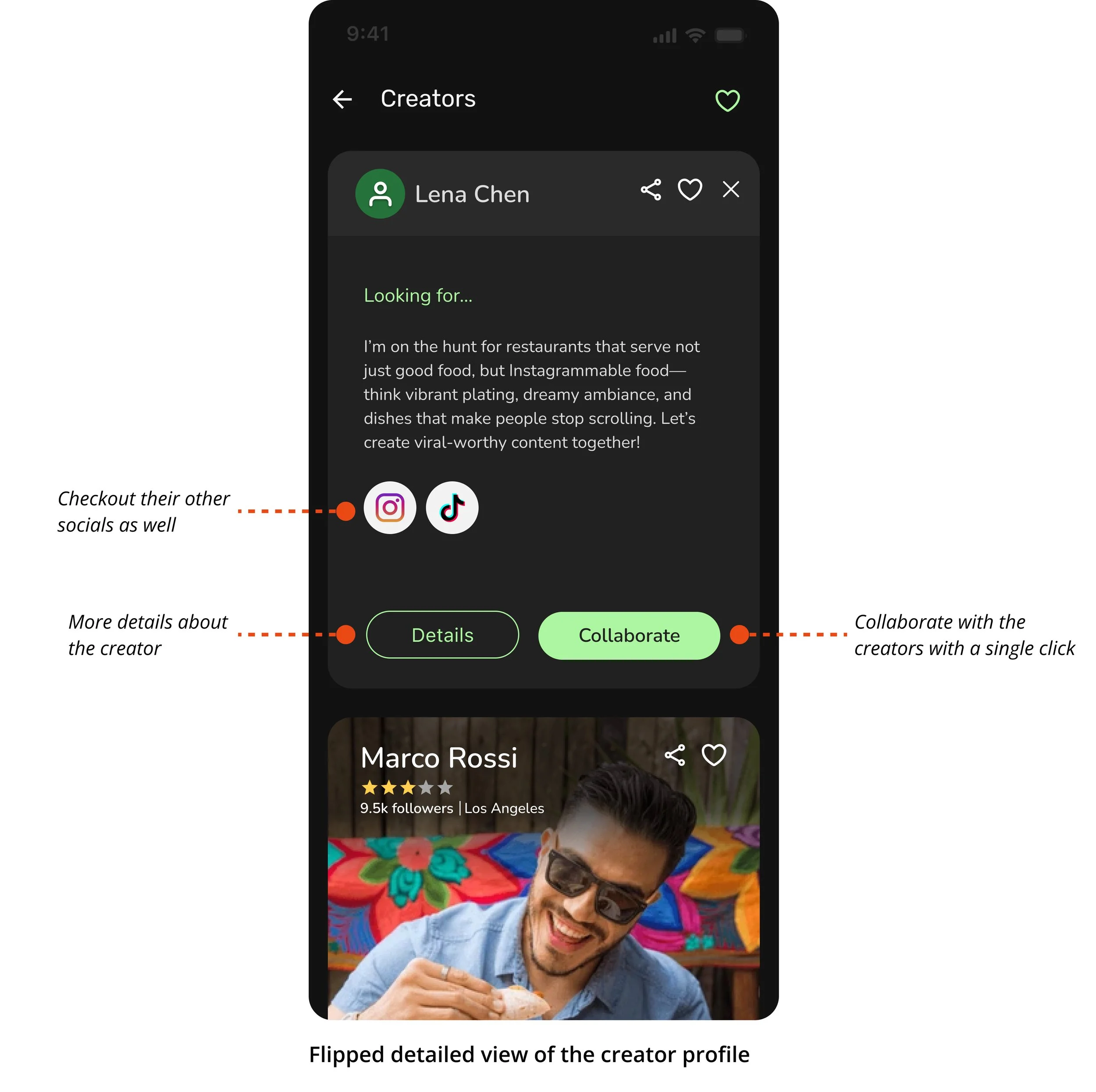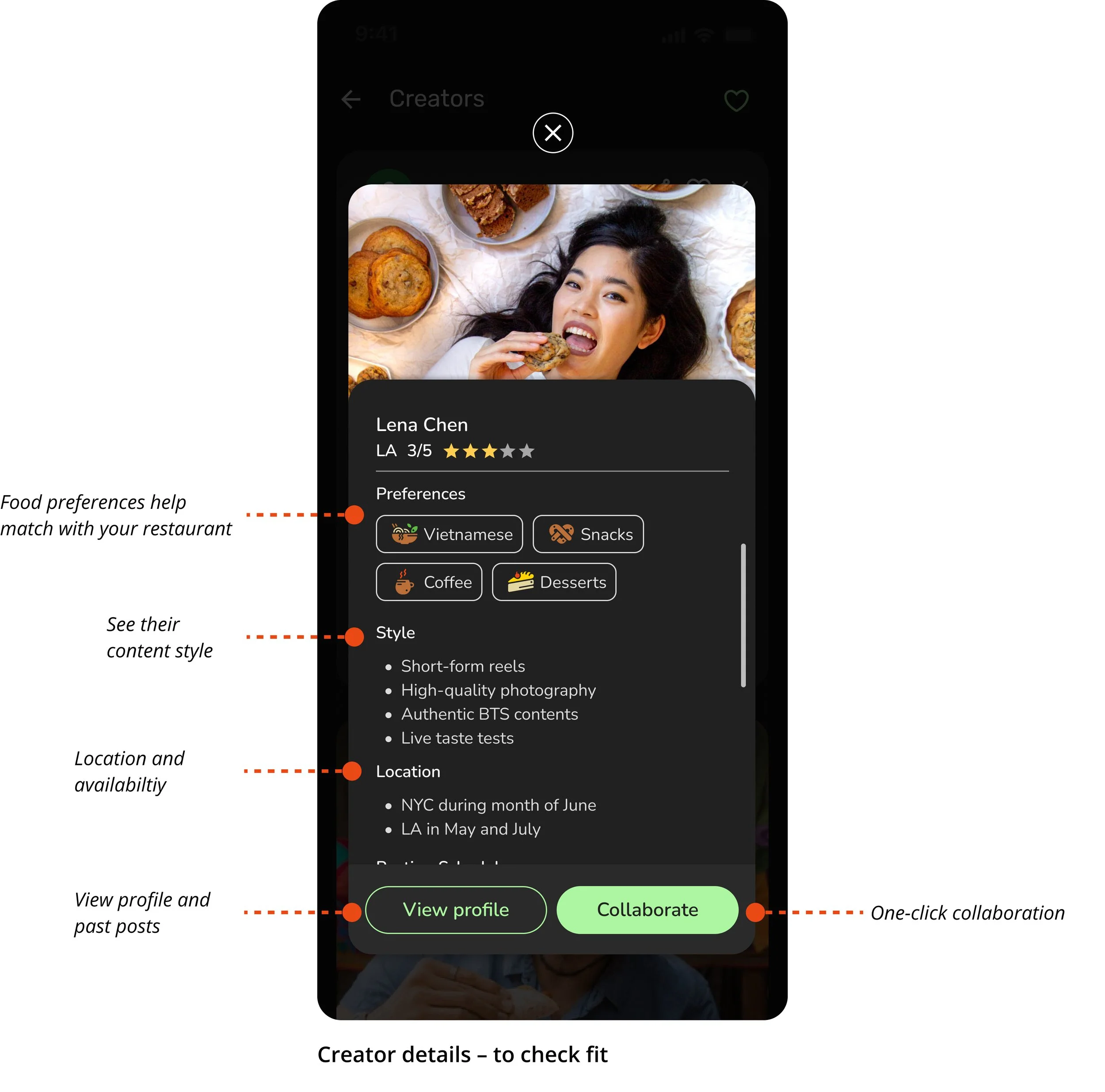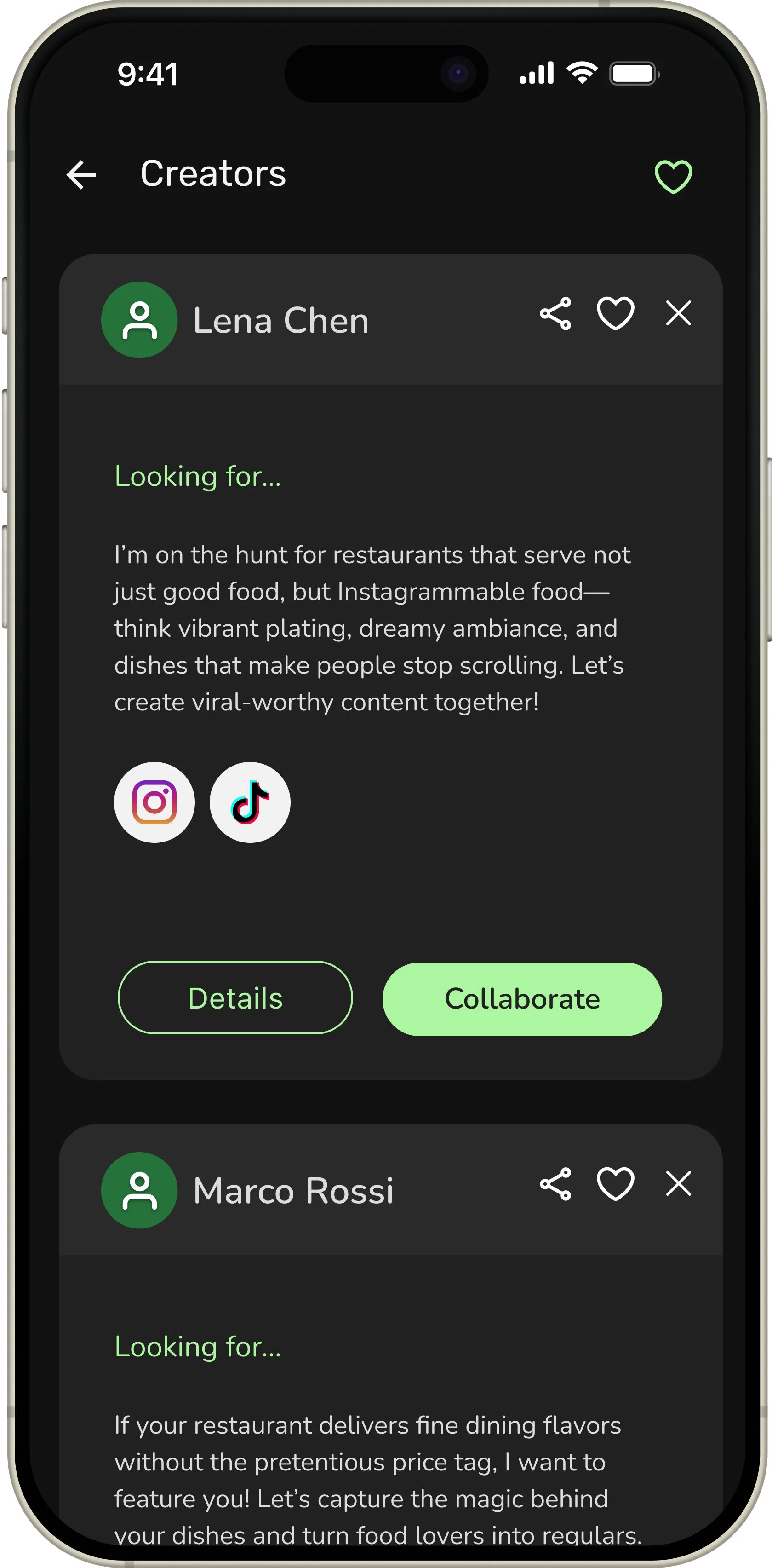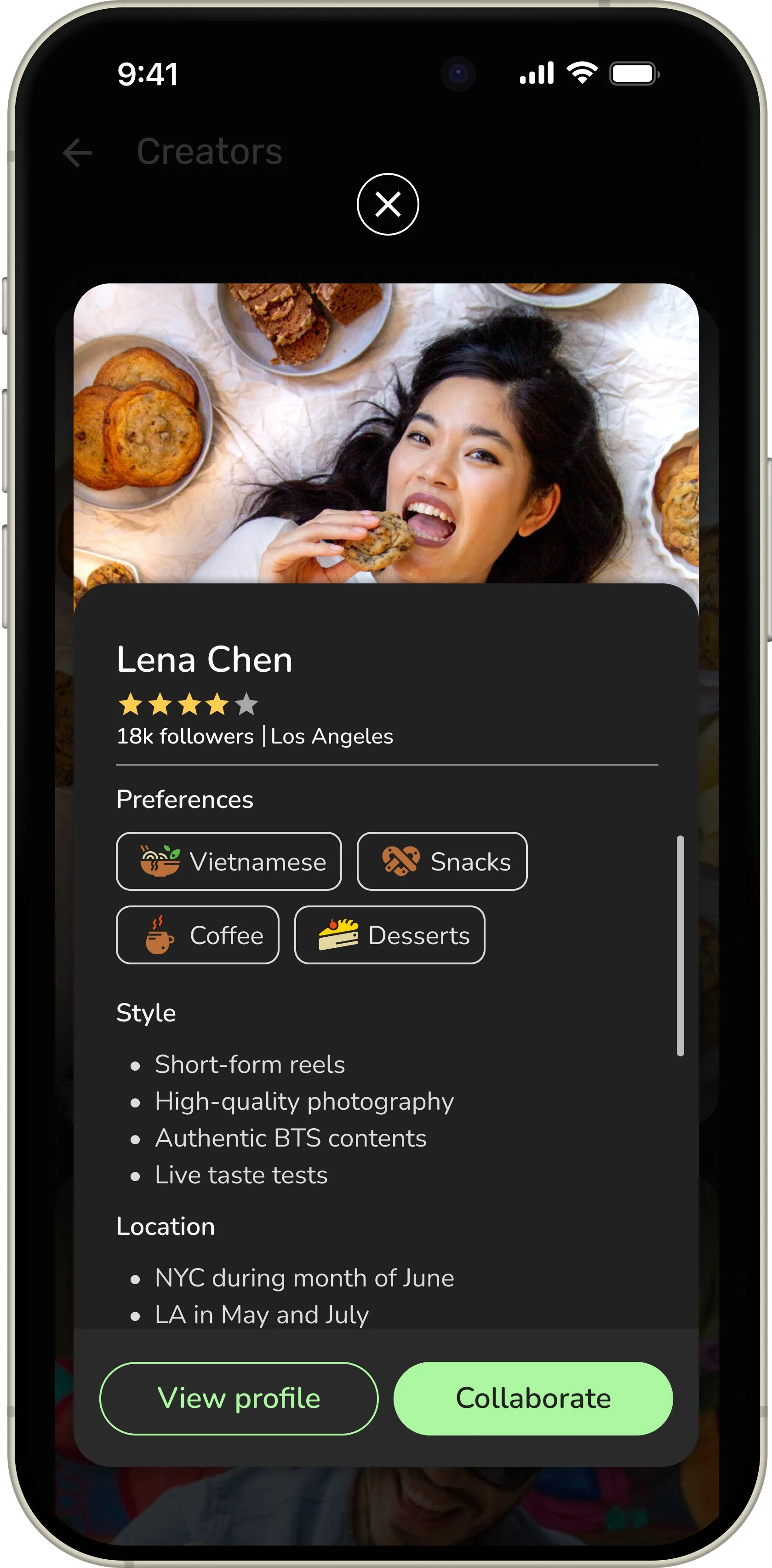 Restaurants can discover creators through profile cards that show rating, follower count, and location upfront. Detailed profiles reveal preferences, content style, and availability, while external social links add credibility. Once the right fit is found, restaurants can send collaboration requests directly in-app with a personalized note, making the process both transparent and relationship-driven.