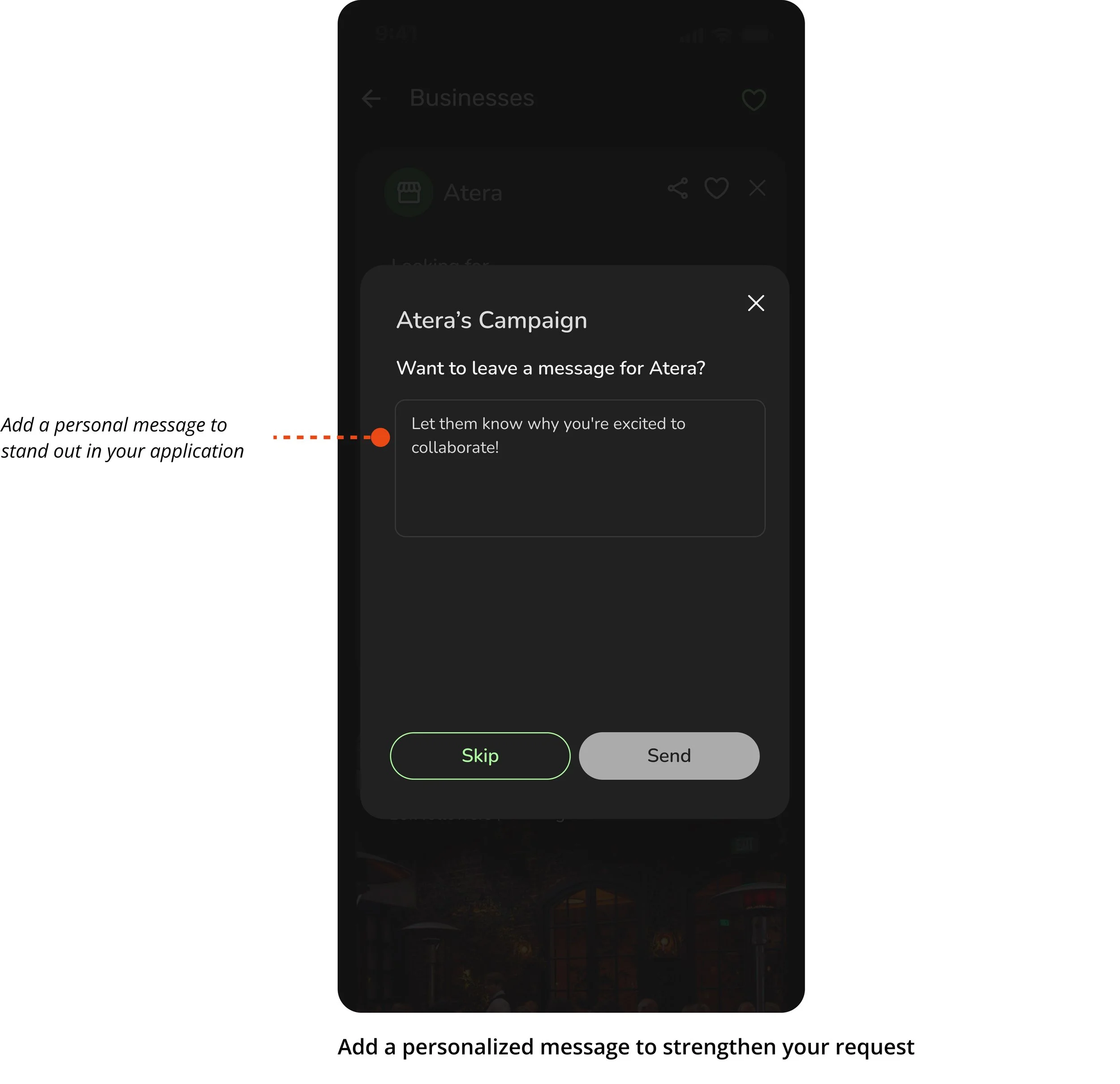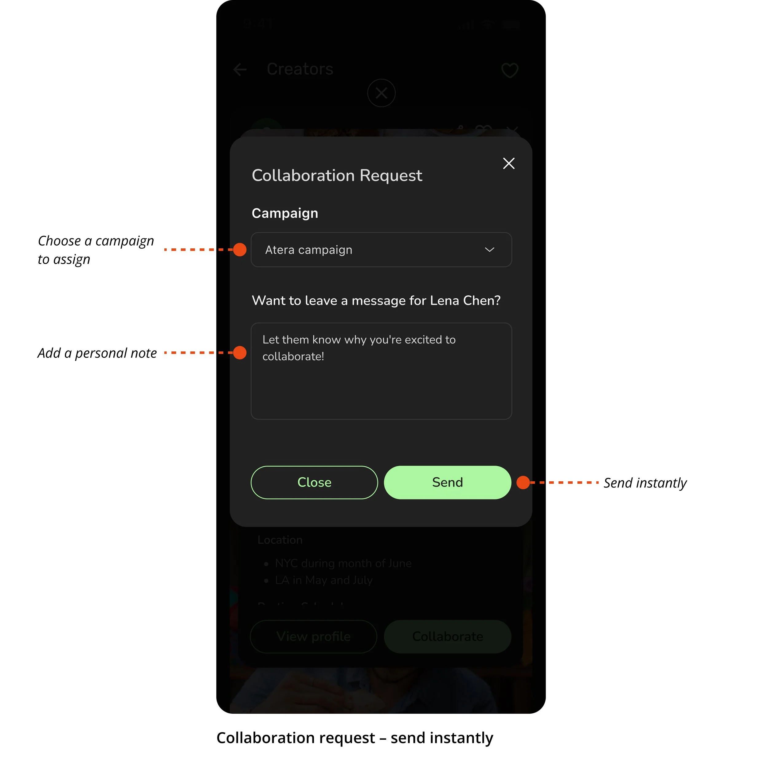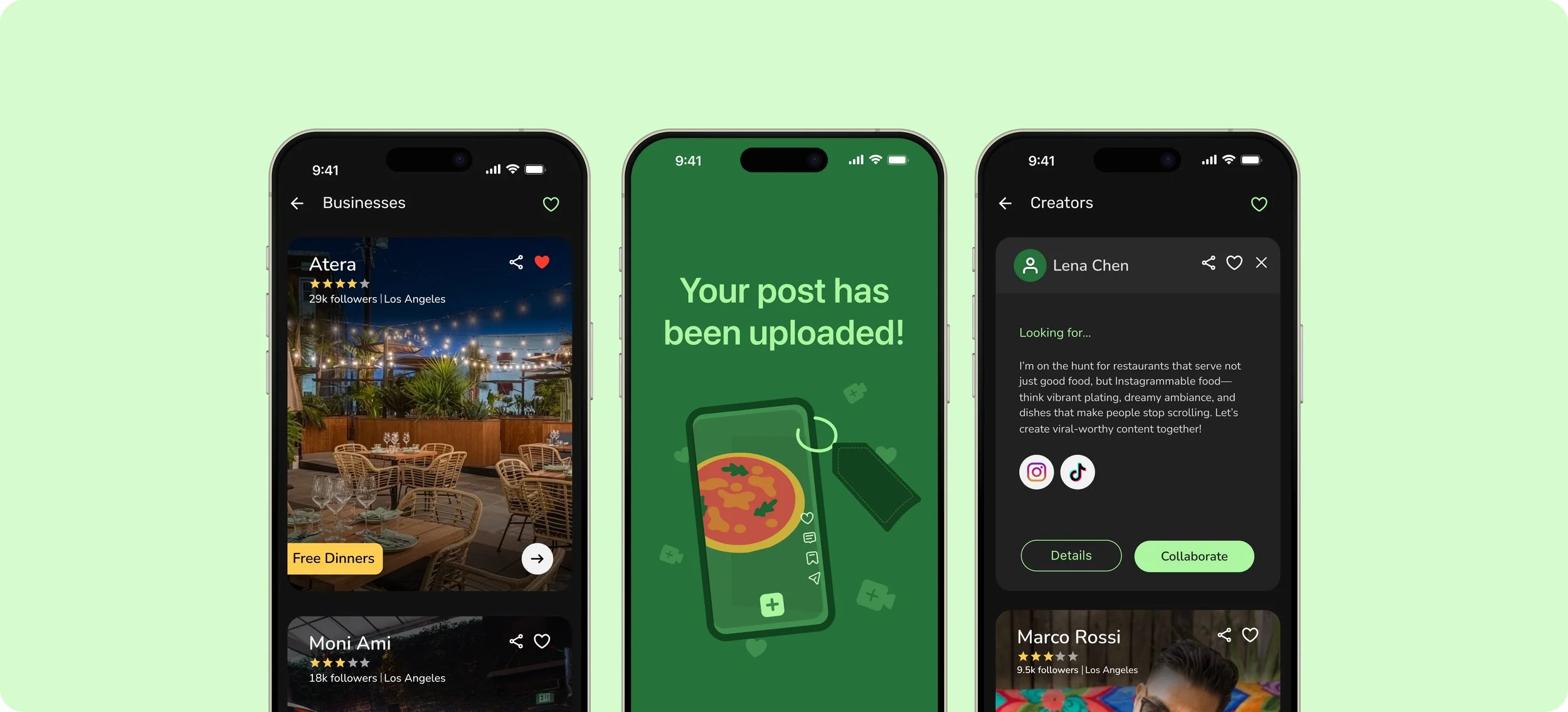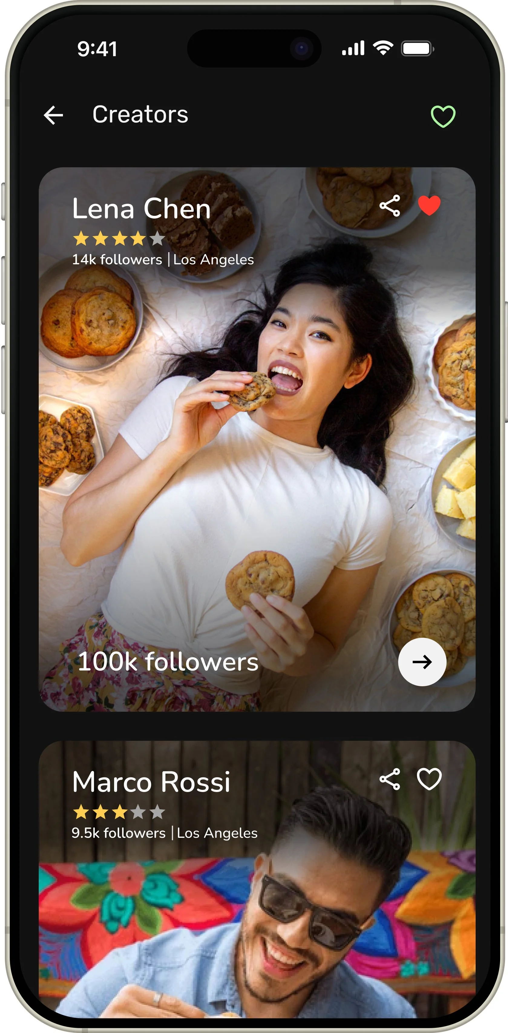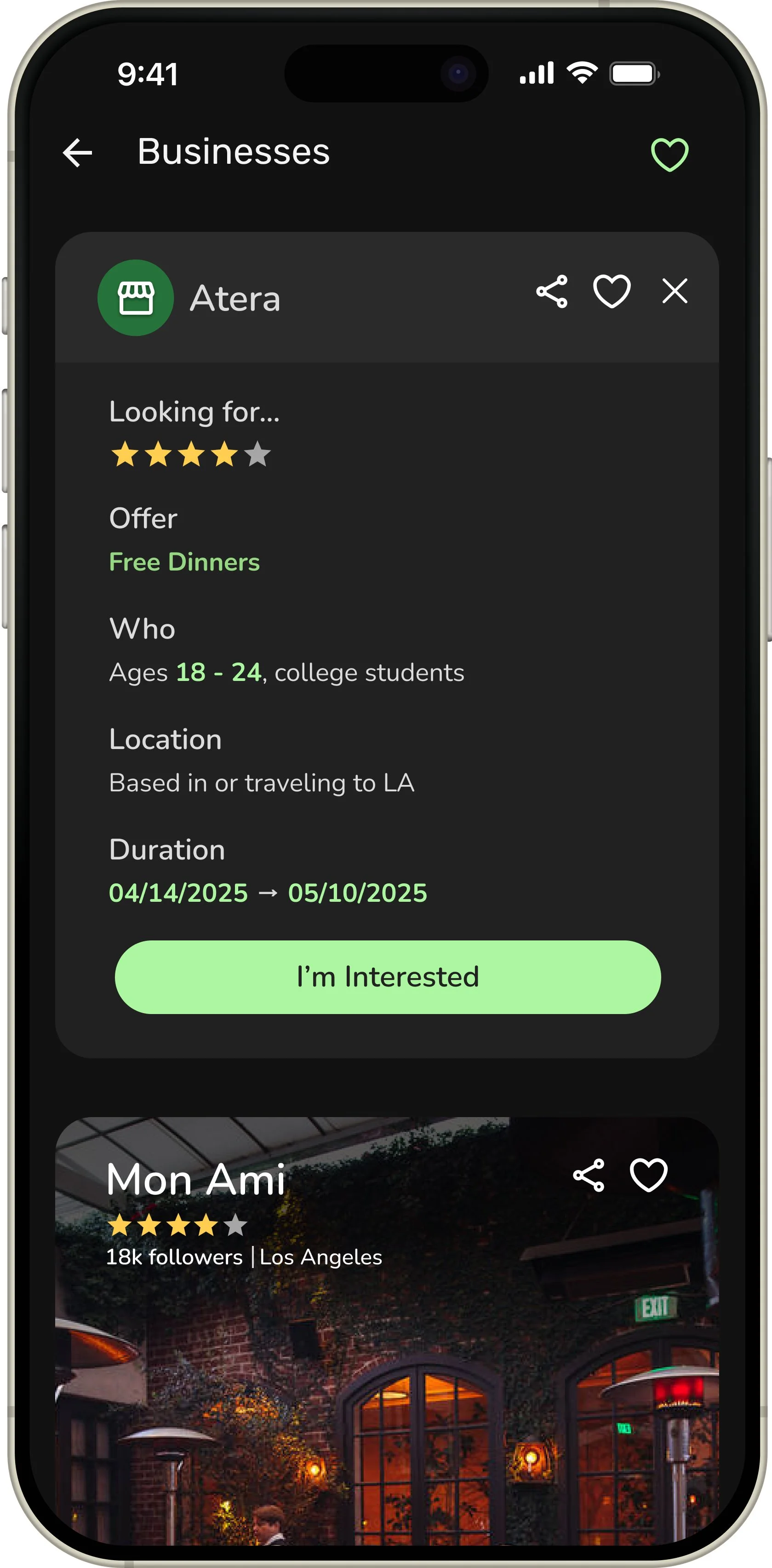 Restaurants can discover creators through profile cards that show rating, follower count, and location upfront. Detailed profiles reveal preferences, content style, and availability, while external social links add credibility. Once the right fit is found, restaurants can send collaboration requests directly in-app with a personalized note, making the process both transparent and relationship-driven.