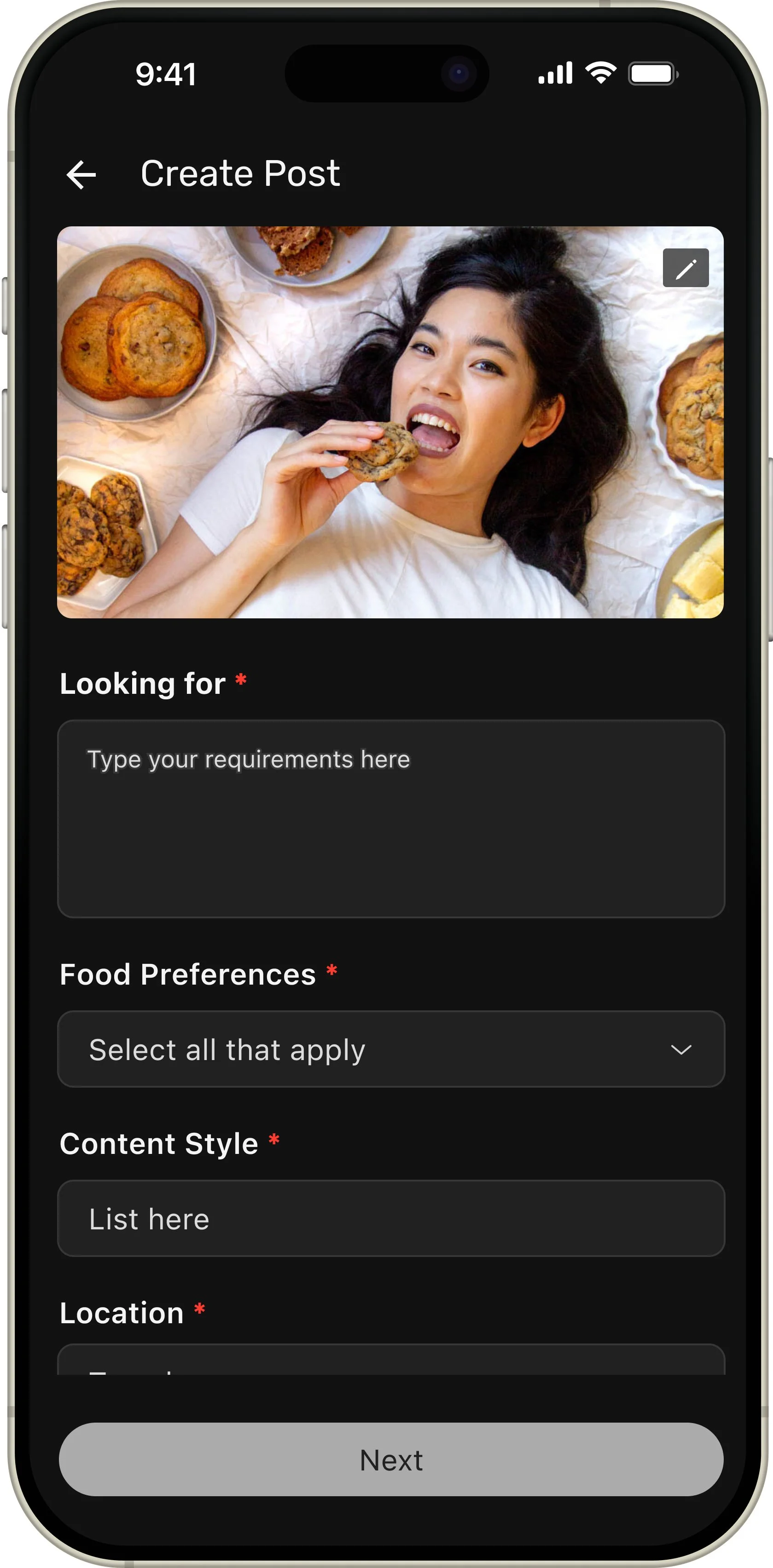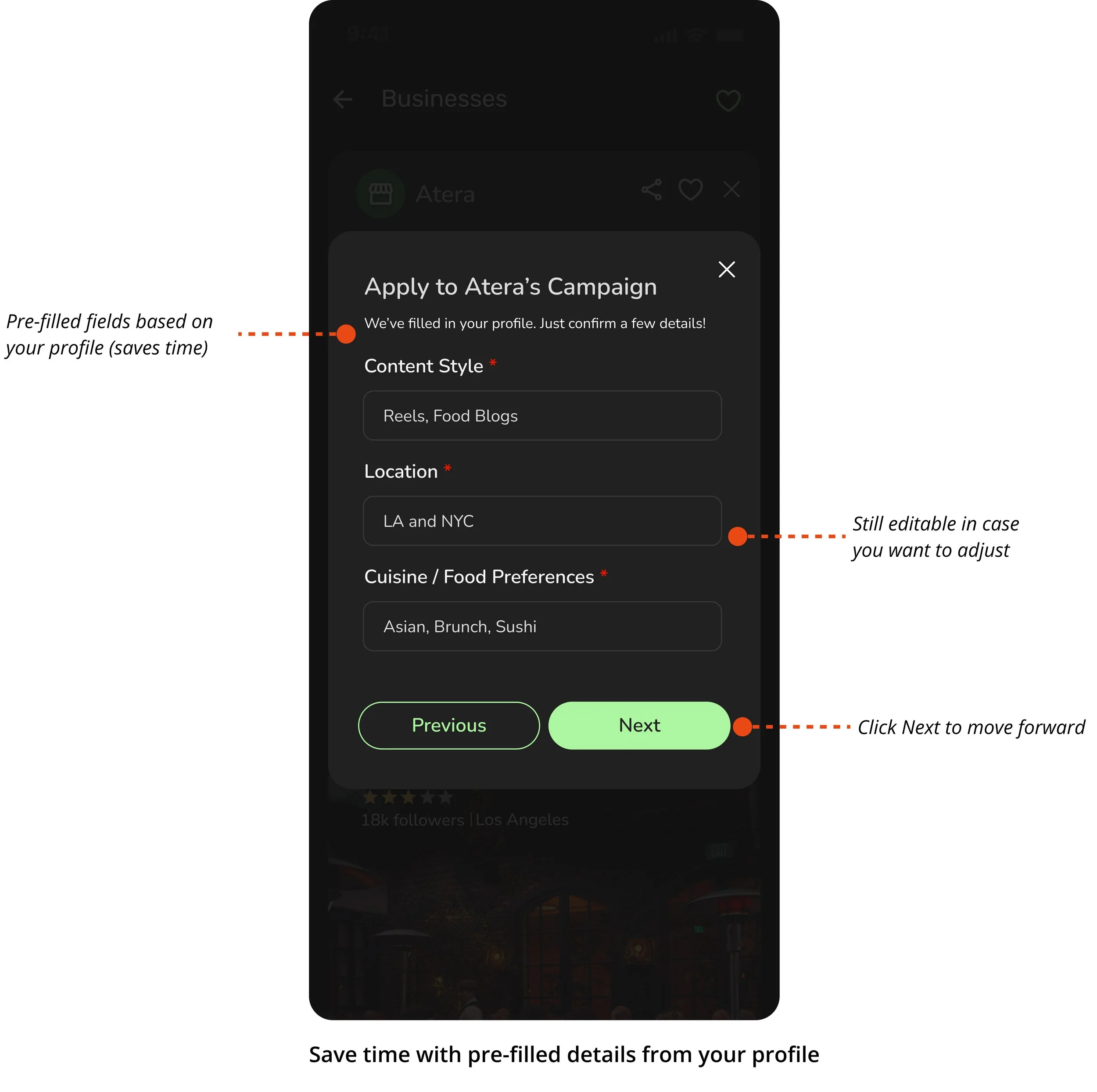 Creators can easily browse campaigns from restaurants, each highlighting the offer, audience, and location upfront. This helps them quickly identify opportunities that align with their niche. The application flow is designed to minimize effort—profile details auto-fill into forms, with flexibility to edit fields as needed.